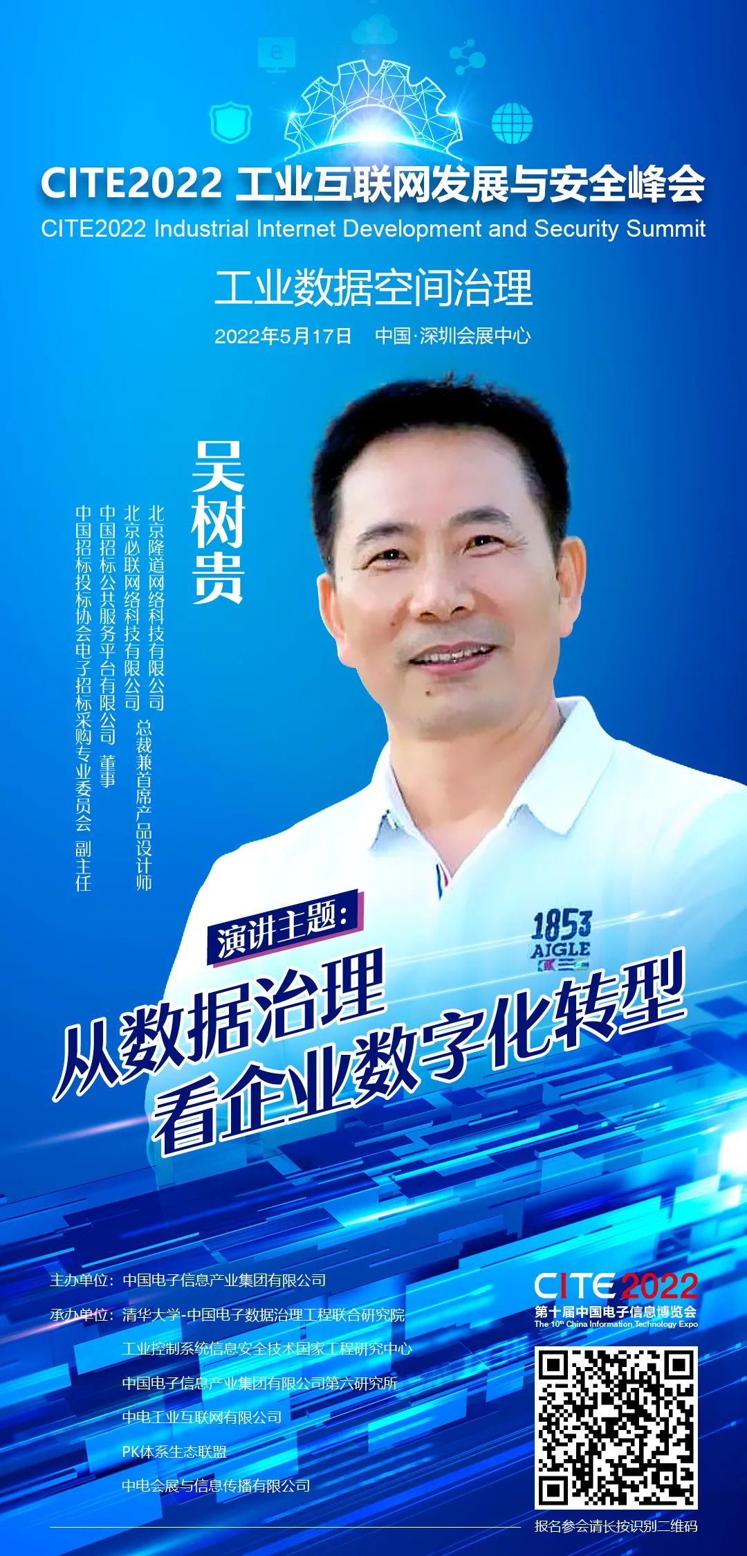 日前,由CITE2022组委会发布的消息得知,吴树贵先生将受邀参加CITE 2022工业互联网发展与安全峰会并进行演讲,其演讲的主题为:从数据治理看企业数字化转型。